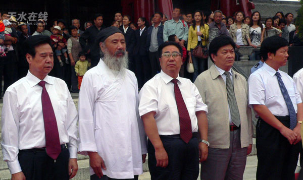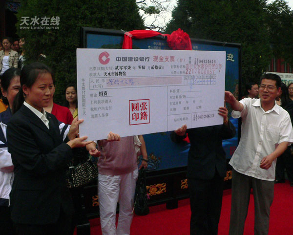 當(dāng)天的儀式上,隴南市向我市捐贈兩塊奇石;慶陽石化總公司董事長張棟杰向伏羲廟捐贈10萬元;世界佛教協(xié)會會長張籍圓向伏羲廟捐贈30萬元;浙江普陀山理航法師捐款1萬元;《玄奘》攝制組總制片人楊玲捐款3萬元;洋河大曲天水辦事處趙軒捐款3000元。虞海燕、朱政英、陶元德分別向隴南市、慶陽石化、張籍圓回贈了紀(jì)念品。