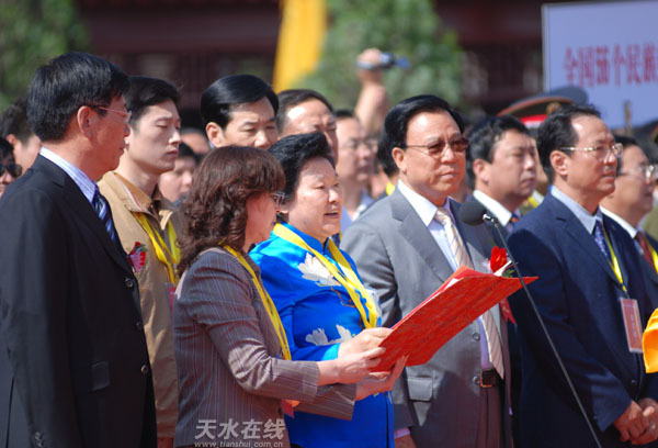 1992年,江澤民同志寫了“羲皇故里”的題詞。如今,天水已成為瞻拜“人文始祖”伏羲的圣地。通過公祭伏羲,必將感召一批又一批龍的傳人投身到祖國的現(xiàn)代化建設(shè),投身到中華民族的偉大復(fù)興。