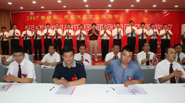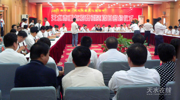 【本報(bào)訊】(記者 郝勤學(xué))6月23日上午,2007年中國·天水伏羲文化旅游節(jié)天水市重點(diǎn)招商引資項(xiàng)目簽約儀式在天水迎賓館舉行,兩區(qū)五縣的60個(gè)重點(diǎn)招商引資項(xiàng)目進(jìn)行了集中簽約。市領(lǐng)導(dǎo)虞海燕、張廣智、張國華、張懷仁、張健、趙衛(wèi)東出席簽約儀式。