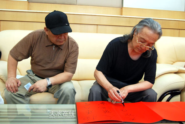 圖為中國書協(xié)理事張榮慶正在為天水在線題詞