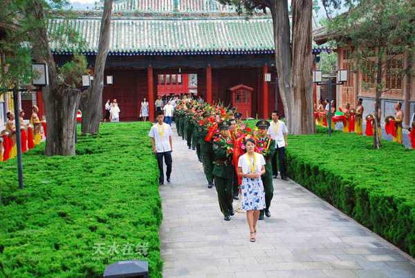 在伏羲廟舉行伏羲祭拜儀式,各方代表向人祖伏羲敬獻(xiàn)花籃。