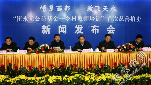 2007年9月,中央電視臺(tái)著名主持人崔永元和中國(guó)紅十字基金會(huì)共同發(fā)起成立了“崔永元公益基金”。該基金旨在募集資金,資助貧困地區(qū)鄉(xiāng)村教師提高執(zhí)教能力,改善和提高鄉(xiāng)村教學(xué)質(zhì)量,舉辦鄉(xiāng)村教師培訓(xùn)班等。在天水舉行的此次拍賣(mài)會(huì),對(duì)于貫徹十七大精神,優(yōu)先發(fā)展教育,培訓(xùn)鄉(xiāng)村教師,實(shí)現(xiàn)教育公平,具有重要意義。