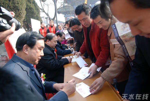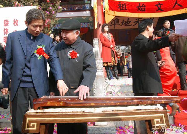 市委副書記、市長張廣智,市政協(xié)主席馮沙駝為《伏羲頌》全國首枚聯(lián)體明信片的發(fā)行揭牌。民間藝人熊尚德向伏羲廟捐贈了古琴,市委常委、宣傳部長孫周秦為熊尚德頒發(fā)收藏證書。