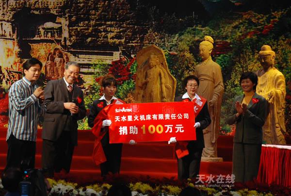 拍賣會上,天水星火機床有限公司現(xiàn)場捐贈100萬元,天水天慶房地產(chǎn)(集團)有限公司、天水陽光集團、天水市市場建設開發(fā)有限公司、天水福門房地產(chǎn)開發(fā)有限公司、天水成紀房地產(chǎn)開發(fā)有限公司、天水嘉通建筑公司、天水永生建筑公司、天水昊峰實業(yè)有限公司、天水三星公司、華龍證券有限責任公司、甘肅盛達集團股份有限公司、甘肅建新實業(yè)集團國內貿易部、上海中電綠科、甘肅省工商聯(lián)房地產(chǎn)業(yè)商會、河北省三建公司等15家企業(yè)成功競拍。天水天慶房地產(chǎn)(集團)有限公司捐贈15萬元,天水陽光集團、天水嘉通建筑公司、天水長城開關廠分別捐贈10萬元。