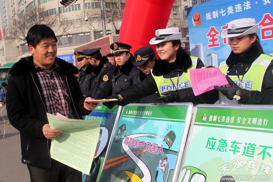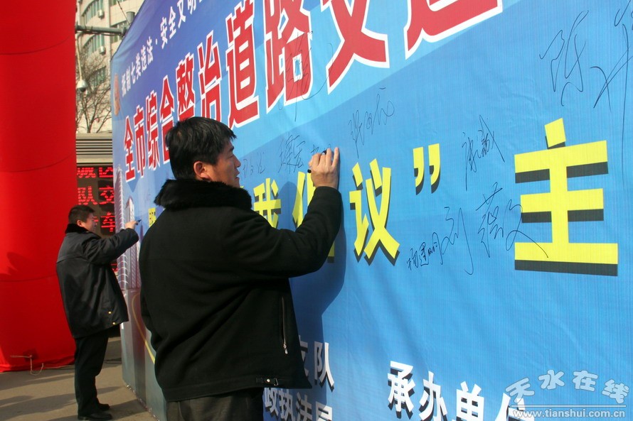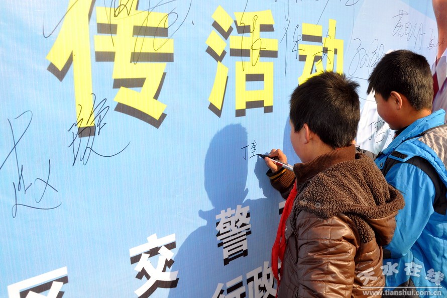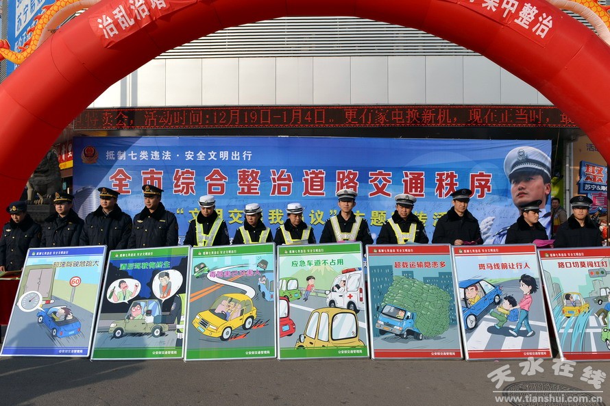2014年12月18日上午11時(shí),天水市秦州區(qū)龍城廣場華西路口人頭攢動,大家紛紛來到背景展板前簽下自己的名字,積極倡議文明參與交通。由市、區(qū)兩級公安交警、綜合執(zhí)法、交通運(yùn)管部門聯(lián)合舉辦的全市綜合整治道路交通秩序“文明交通我倡議”主題宣傳活動正式來開序幕。