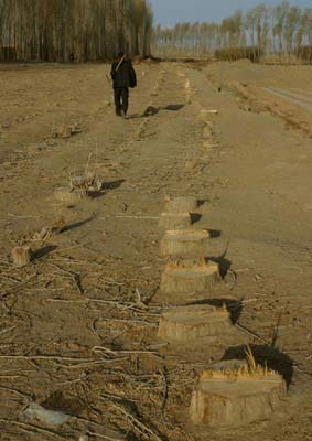 | 2007年4月27日,護林帶上的樹木被砍伐掉,村民行走的村莊道路還能保留多久。 |