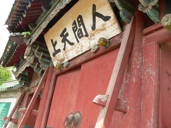 “人間天上”牌樓后,就是玉皇大殿。玉泉殿是玉泉觀現存的明代建筑群中最宏偉的古建筑,坐落在五十三級臺階上,意清乾隆五十三重建。大殿坐落在2米多高的臺基上,前為抱廈,抱廈后為玉皇殿,大殿綠瓦蓋頂,正脊飾樓閣亭,殿內黃絲絨遮起大龕,塑有玉皇大帝像,兩壁有彩繪三十二天朝玉帝巨幅壁畫。殿門正中有蘭底金字大匾“沖虛無象”和黑底金字對聯,聯曰: