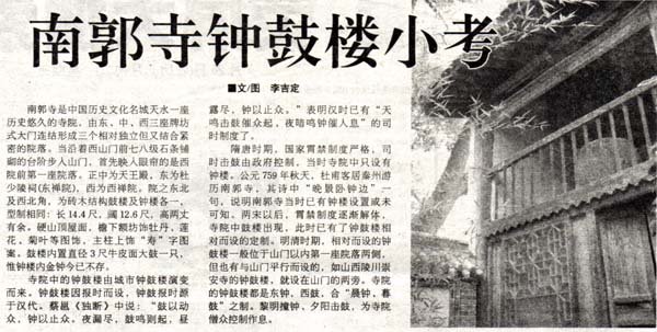 隋唐時(shí)期,國(guó)家霄禁制度嚴(yán)格,司時(shí)擊鼓由政府控制,當(dāng)時(shí)寺院中只設(shè)有鐘樓。公元759年秋天,杜甫客居秦州游歷南郭寺,其詩(shī)中“晚景臥鐘邊”一句,說(shuō)明南郭寺當(dāng)時(shí)已有鐘樓設(shè)置或未可知。兩宋以后,霄禁制度逐漸解體,寺院中鼓樓出現(xiàn),此時(shí)已有了鐘鼓樓相對(duì)而設(shè)的定制。明清時(shí)期,相對(duì)而設(shè)的鐘鼓樓一般位于山門以內(nèi)第一座院落兩側(cè),但也有與山門平行而設(shè)的,如山西陵川崇安寺的鐘鼓樓,就設(shè)在山門的兩旁。寺院的鐘鼓樓都是東鐘,西鼓,合“晨鐘、暮鼓”之制。黎明撞鐘、夕陽(yáng)擊鼓,為寺院僧眾控制作息。